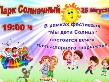 25 августа в рамках фестиваля «Мы-дети солнца» в парке «Солнечный» состоялся вечер фольклорного творчества. В этом празднике принимали участие фольклорные и ...