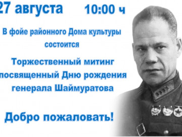 Сегодня, 26 августа, в районном Доме культуры состоялось торжественное мероприятие, посвященное 123-летию со дня рождения Героя России генерала- майора Минигали Мингазовича ...