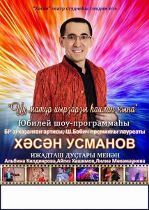 Главная / Афиша / ХАСАН УСМАНОВ ХАСАН УСМАНОВ Дорогие друзья! Приглашаем вас 8 декабря в районный Дом культуры, на юбилейную шоу — программу Заслуженного артиста Республики Башкортостан ХАСАНА УСМАНОВА. Начало: 19.00 ч., цена билета: 300 рублей. Добро пожаловать!