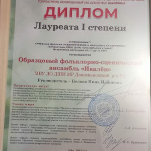В НЕМ ПРИНЯЛ УЧАСТИЕ И ПОЛУЧИЛ ДИПЛОМ ЛАУРЕАТА 1 СТЕПЕНИ ДЕТСКИЙ ОБРАЗЦОВЫЙ ФОЛЬКЛОРНО — СЦЕНИЧЕСКИЙ АНСАМБЛЬ » ИВАЛЁН»