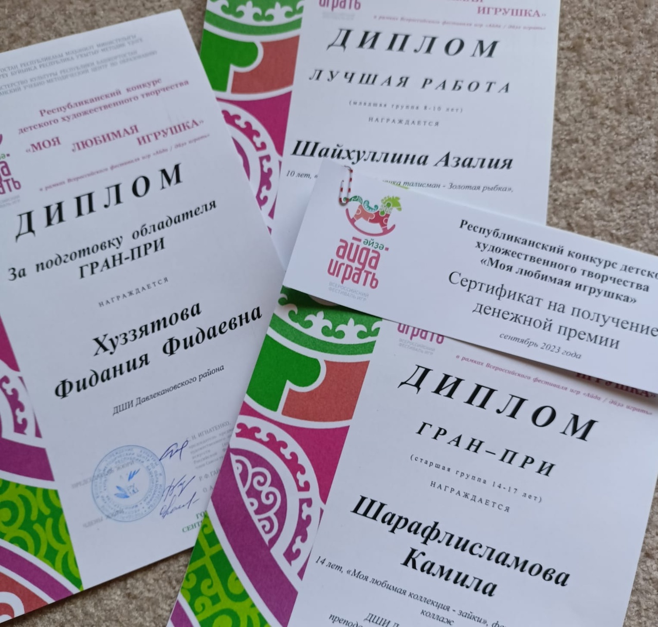 На конкурс было представлено более 500 живописных и декоративно-прикладных работ. По итогам работы жюри обладателем Гран-при стала Шарафлисламова Камила, 14 лет, «Моя любимая коллекция – зайки», фетр, аппликация, коллаж, ДШИ Давлекановского района, преподаватель Хуззятова Фидания Фидаевна, также определены 50 лучших работ выставка которых состоялась с 14 по 17 сентября 2023 года в Уфе в рамках Всероссийского фестиваля игр «Айда/Әйҙә играть», среди них одна из лучших работ в