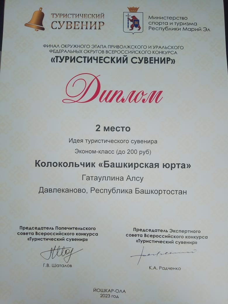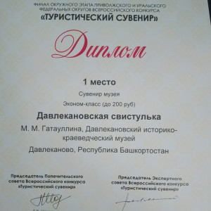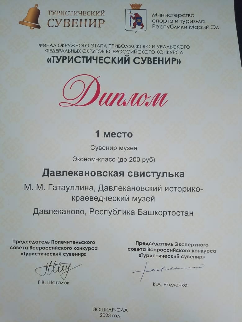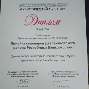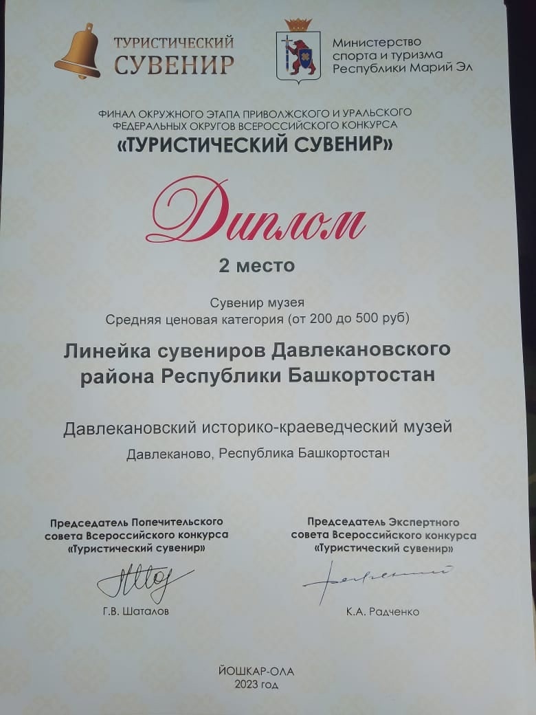 Сотрудники Давлекановского историко-краеведческого музея вернулись из Марий Эл и привезли два 1-х места в номинациях — «Сувенир музея», «Сувенир для детского туризма» и три 2-х места в номинациях «Линейка сувениров Давлекановского района», «Туристического маршрута», «Идея туристического сувенира».