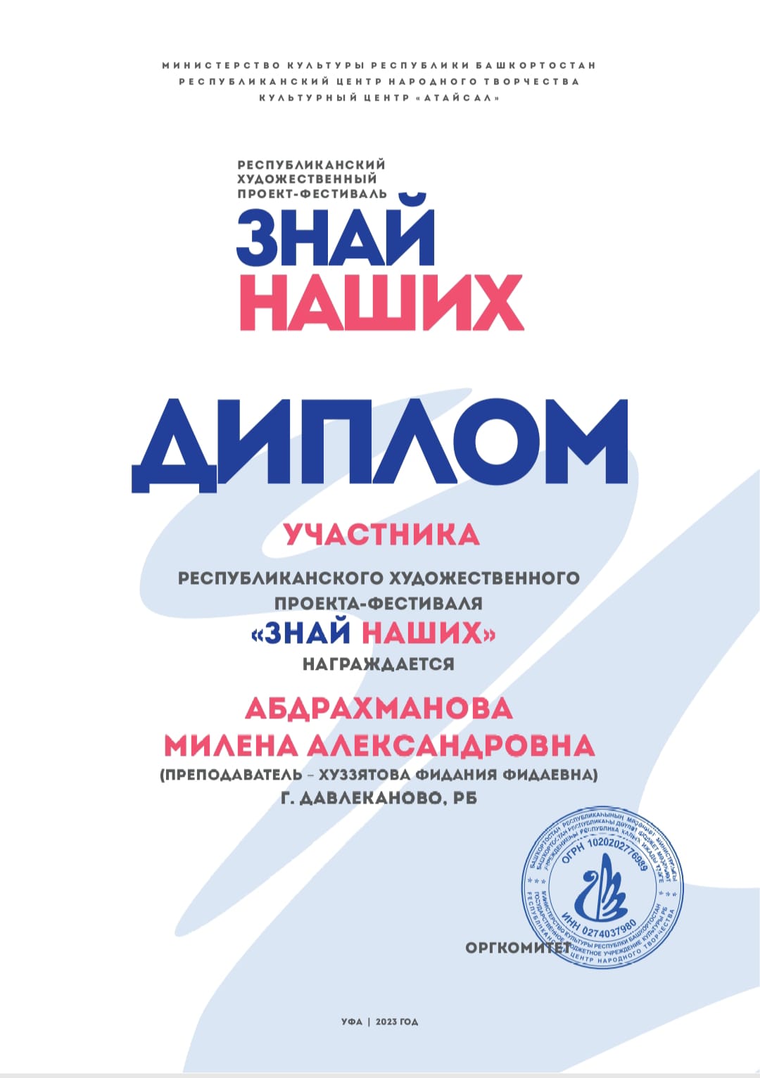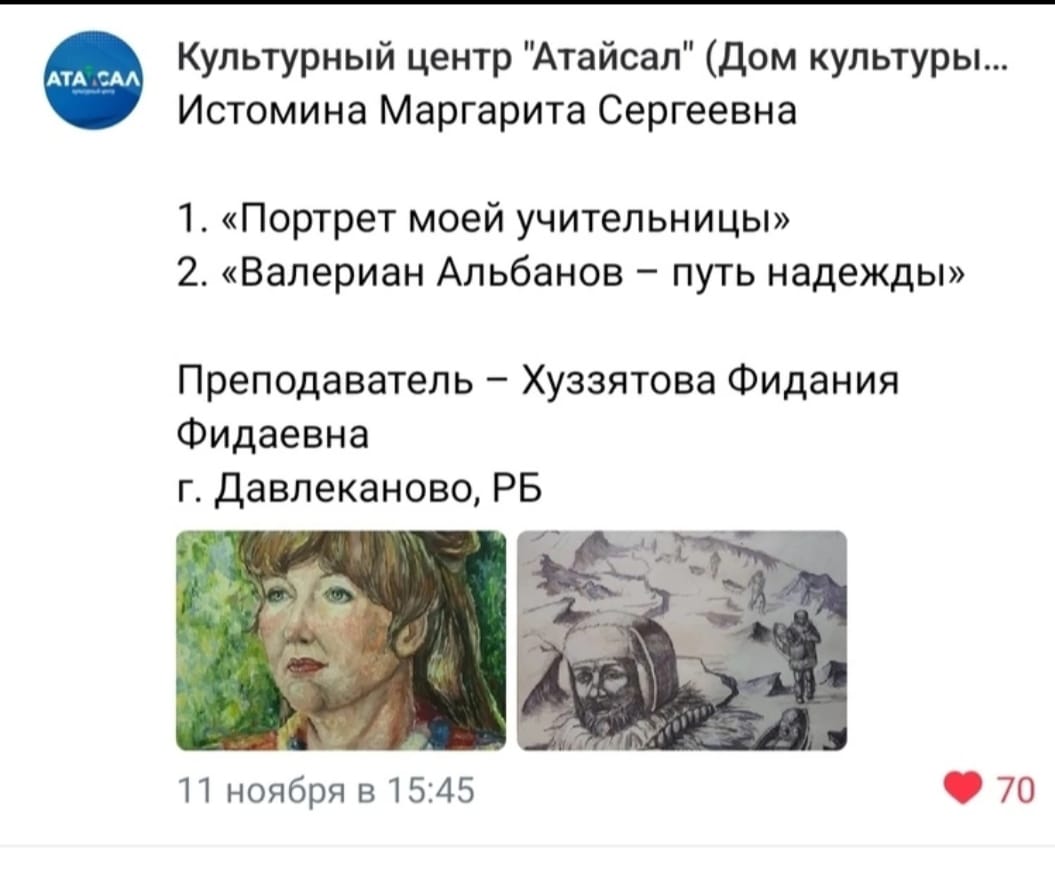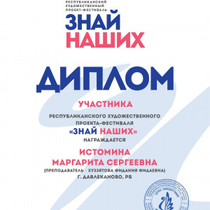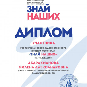 Воспитанники художественного отделения Детской школы искусств г. Давлеканово стали дипломантами и вышли в финал Республиканского художественного проекта-фестиваля «Знай наших».Этот проект посвящён выдающимся личностям, оказавшим влияние на умы и сердца людей, формирующих их жизненные позиции и устремления.