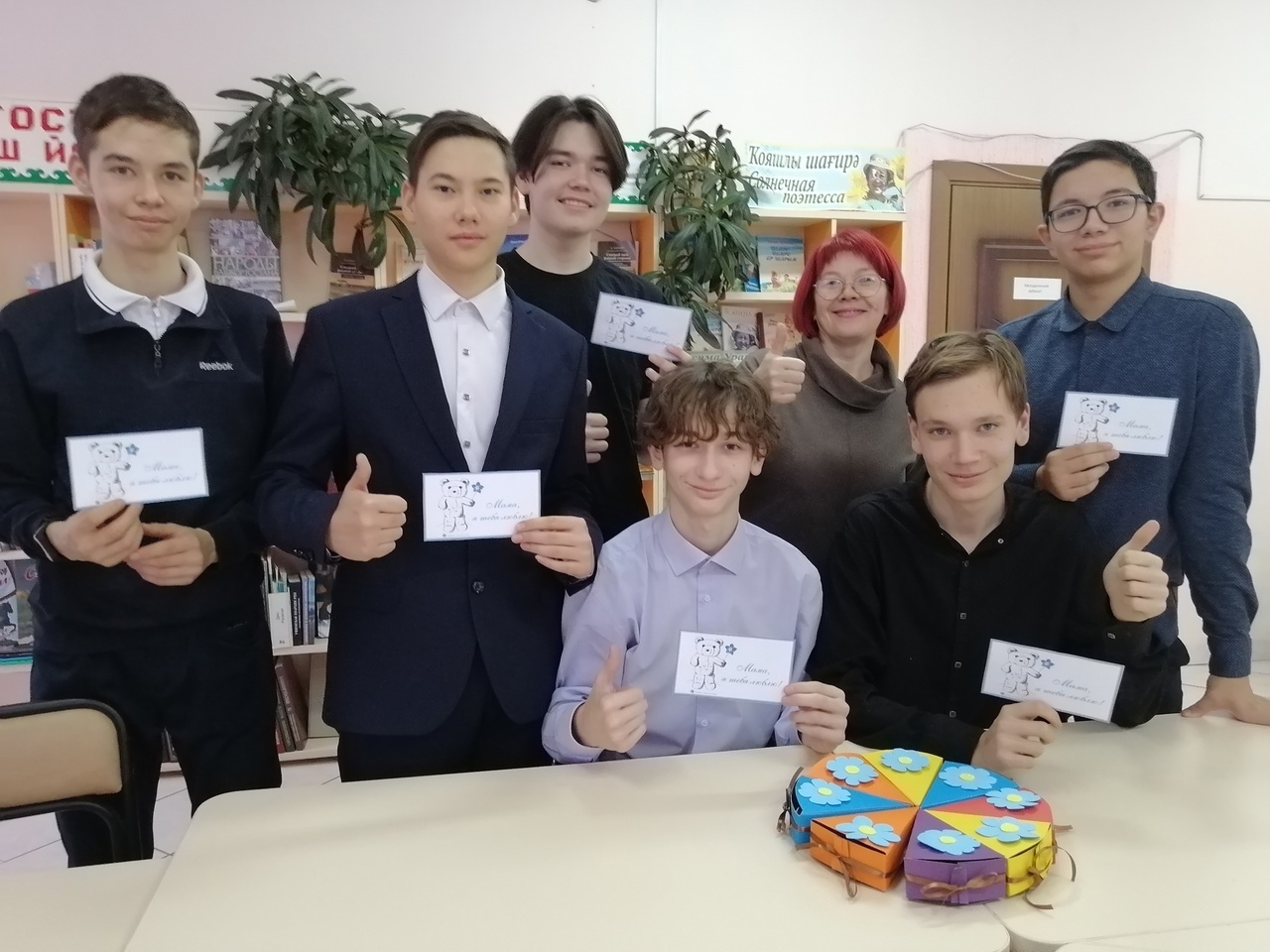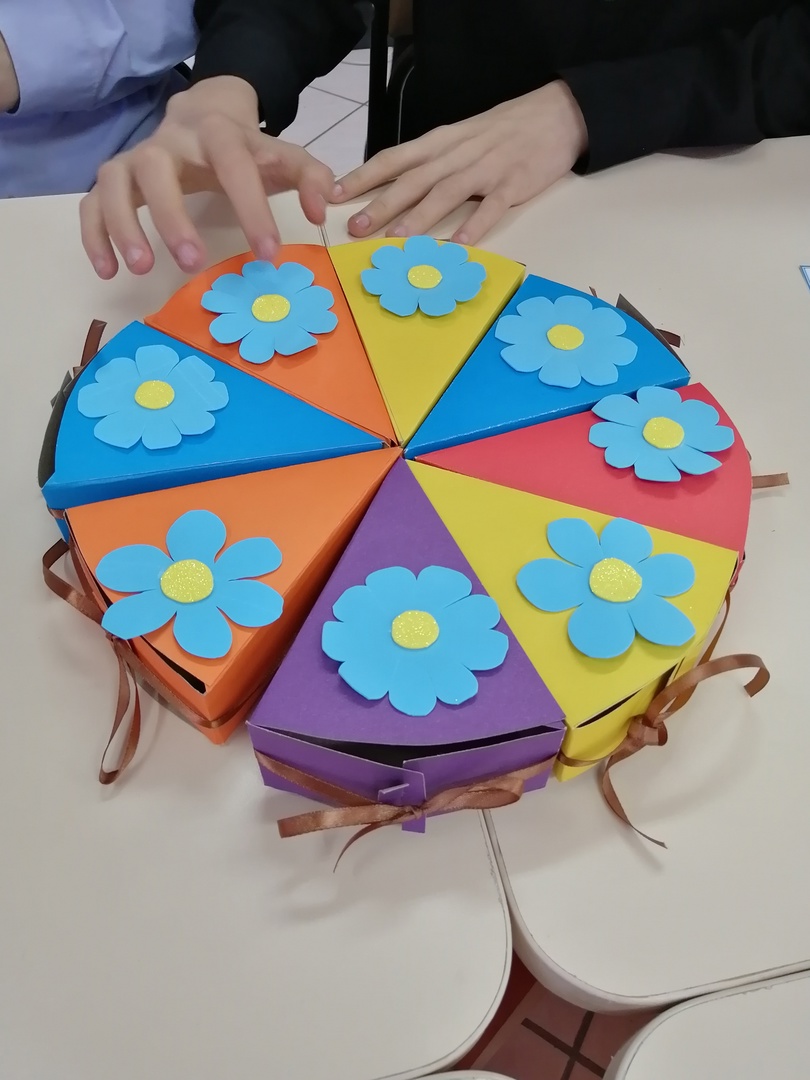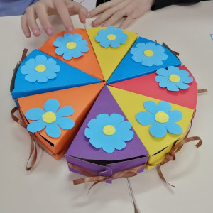 И мы со своими читателями не остались в стороне. Учащиеся 9 кл. гимназии № 5 совместно с художником – оформителем Стояновой Л.А. сделали для своих мам подарочный торт – сувенир. Ребята с большим интересом трудились над своими работами — ведь каждый старался порадовать любимую маму своим подарком.