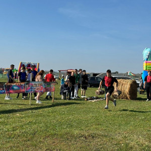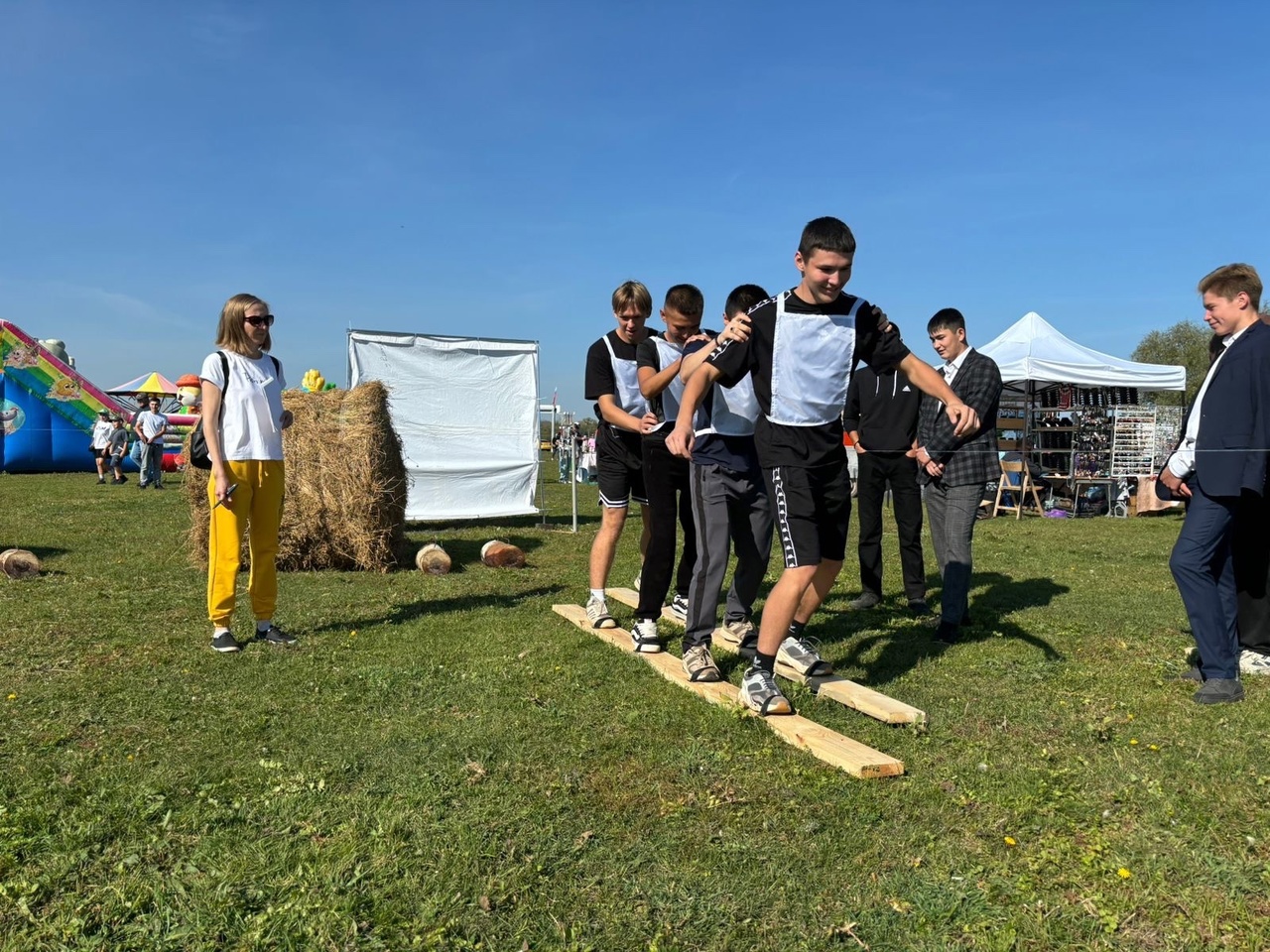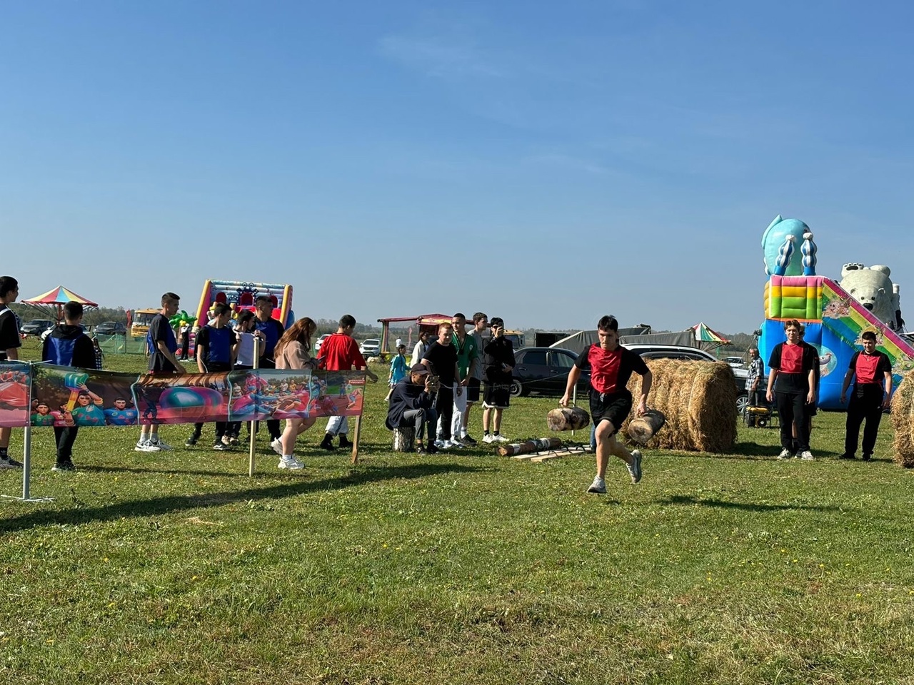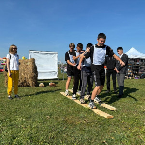 Весело прошли национальные народные игры: бой с мешками на бревне, поднятие гирей, лазание на вертикальный шест, битье горшков, бег в мешках, бег с яйцами на ложках.