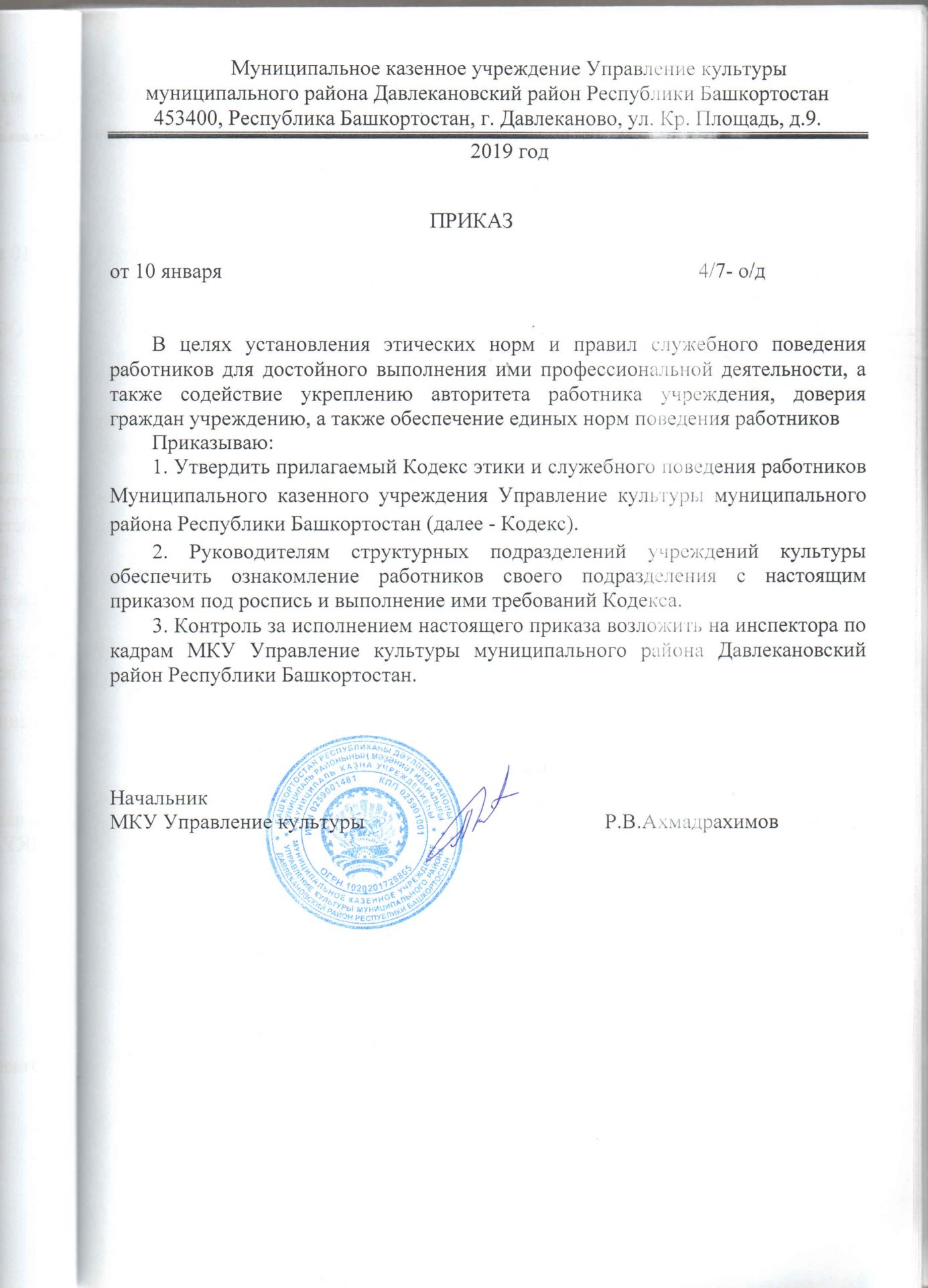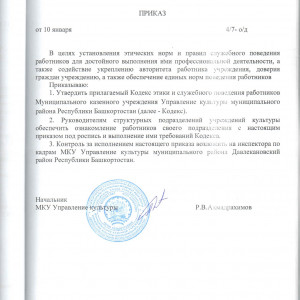Главная / Противодействие коррупции / Документы по противодействию коррупции МКУ Управление культуры МР Давлекановский район Республики Башкортостан / Приказ №4/7-о/д об утверждении Кодекса и служебного поведения работников МКУ Управление культуры Приказ №4/7-о/д об утверждении Кодекса и служебного поведения работников МКУ Управление культуры